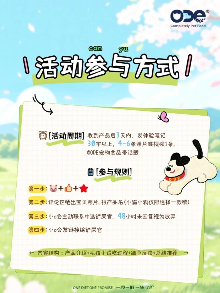 - Within 3 days of receiving the product, you must post a review (30+ words, 4–6 photos or 1 video), leave a 5-star rating + comment link, and post on Xiaohongshu (RedNote) tagging @ODE Pet Food with the campaign hashtags.